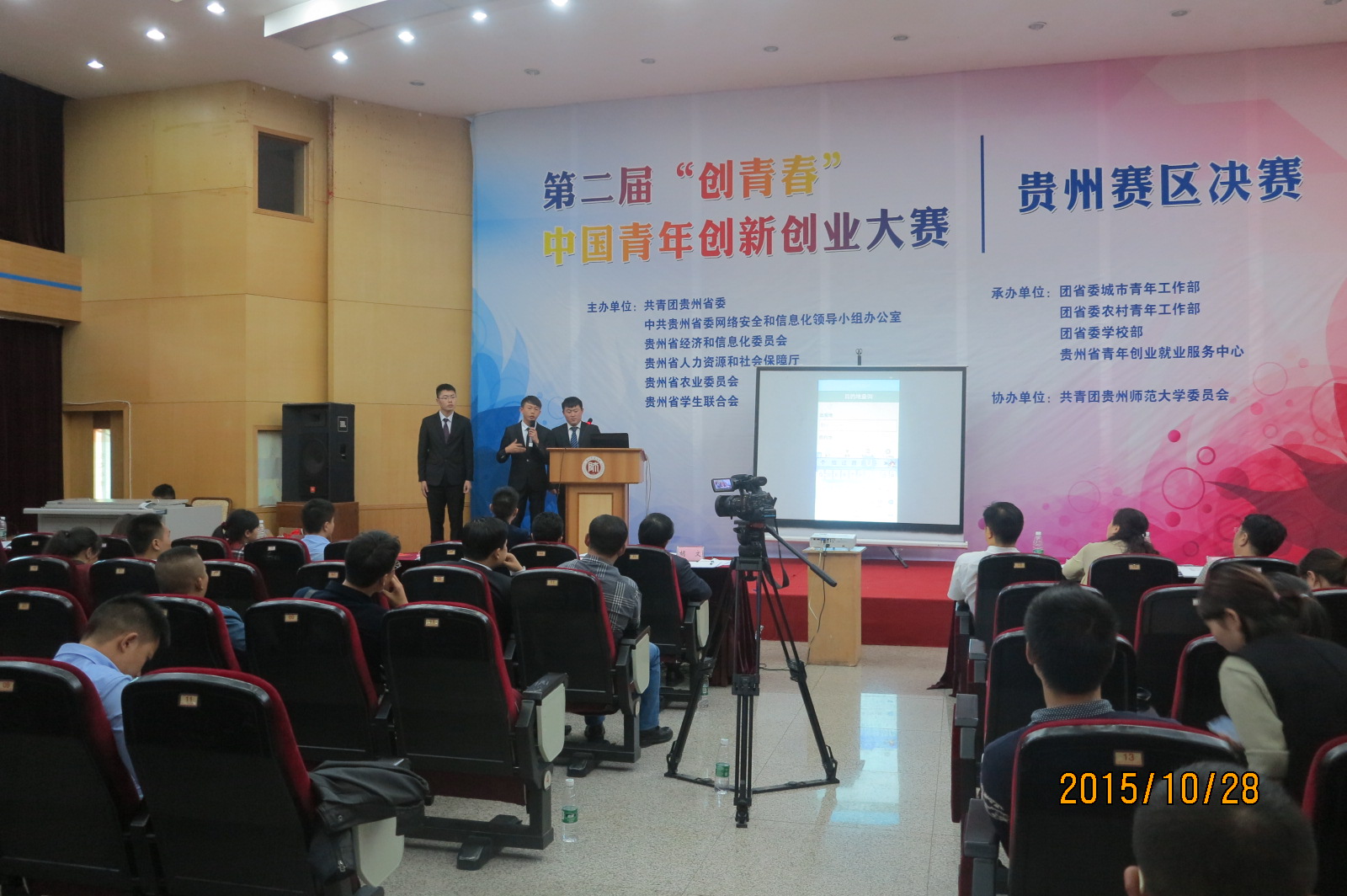 本次大赛由共青团贵州省委、省委网信办、省经信委、省人力资源社会保障厅、省学联、省农委联合主办,贵州师范大学团委承办,共吸引了300多个项目参赛。经过资格审查、初赛、复评等环节,最终26个优秀项目脱颖而出,进入贵州决赛,决赛分商工组和现代农业组分别进行。决赛由参赛选手用5分钟时间对参赛项目进行多媒体演示推介,再用3分钟现场答辩的方式组成,评委将根据参赛选手对项目整体情况的展示评选出获奖项目,我院参赛选手在比赛中沉着冷静,围绕项目简介、项目特色、应用前景等方面作了阐述,突出了作品的创新性和应用性,得到了专家评委的一致认同。