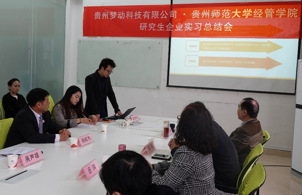 会上,贵州梦动科技有限公司校企合作部经理赵永红、企业指导老师吴声雄及梁正云等,分别就企业实训基地发展现状、研究生实习方案的执行、企业指导老师的工作及我院研究生的实习情况做了详细介绍,并对我院研究生在该公司的实习表现给予充分的肯定和赞扬。吴寓娇代表实习同学对他们的实习作了汇报。