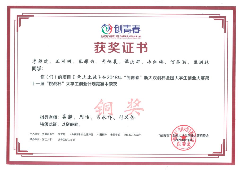 11月3日,由共青团中央、教育部、人力资源和社会保障部、中国科协、全国学联、浙江省人民政府主办,浙江大学、共青团浙江省委承办的2018年“创青春”浙大双创杯全国大学生创业大赛第十一届“挑战杯”大学生创业计划竞赛终审决赛在浙江大学落下帷幕。由我院刘晓婧老师指导,黎燕京等同学完成的项目《津津乐导》,由叶盈吟、吕萍、陈椽、王嘉老师指导,罗大尉等同学完成的项目《基于校农对接的农产品大数据交易平台》,由易静、周怡、易永祥、付义荣老师指导,李福建等同学完成的项目《云上土地》在大赛中荣获铜奖。