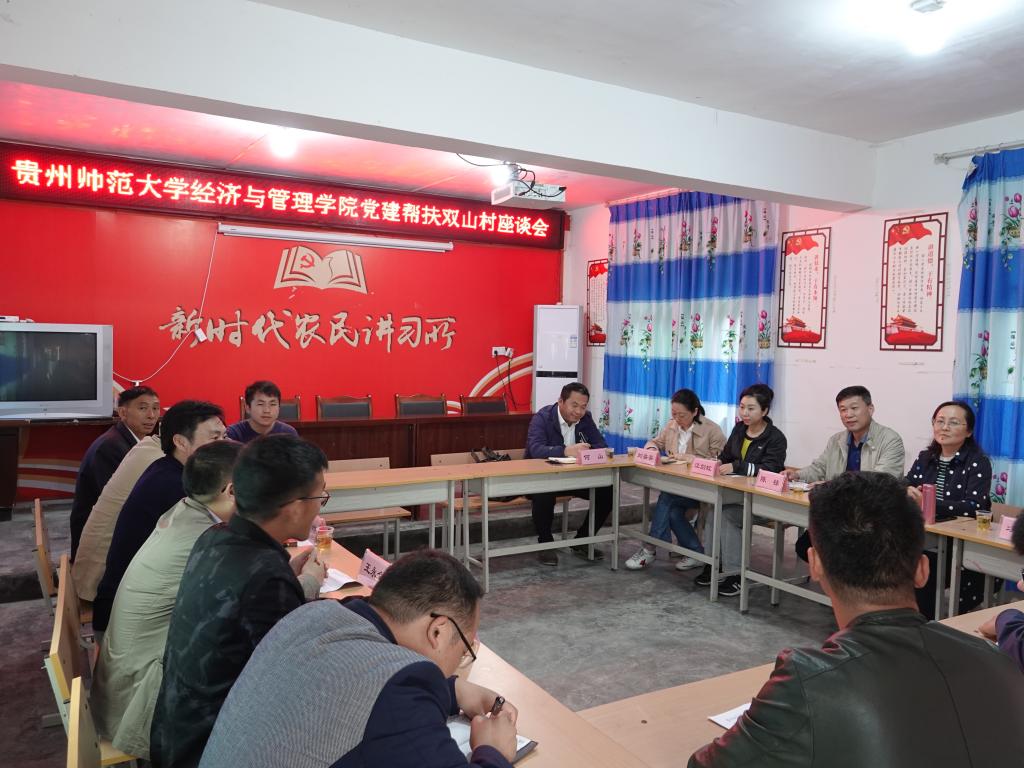 之后,陈长钧就2018年双山村脱贫攻坚工作的开展情况、具体做法、后续问题以及今后打算等作了详细介绍。他对经管学院给予双山村的帮扶表示衷心感谢,对驻村第一书记李庆同志的工作表现给予高度肯定,并提出了双山村下一步的发展需求。经管学院康文峰博士、何山博士就双山村当前水稻和花椒种植、休闲度假旅游项目开发等进行深入了解,并提出发展建议。双方还围绕党建结对共建的其他内容展开了亲切座谈,包括开展“讲村史、看变化、感党恩”主题实践活动,组织暑期“三下乡”社会实践活动,针对党员干部讲党课,依托专业优势为产业发展提供智力支持等,共商共议解决问题的办法和措施,达成帮扶合作意向共识。