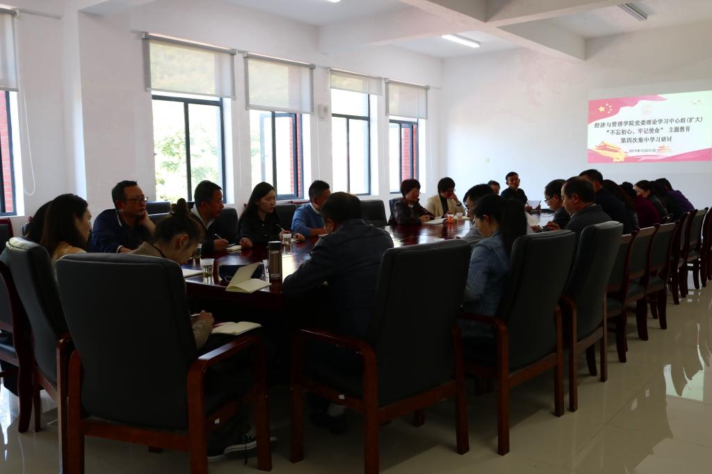 10月31日下午,经济与管理学院在花溪校区学院会议室召开党委理论学习中心组(扩大)“不忘初心、牢记使命”主题教育第四次集中学习研讨。学校第一督导组组织长孙克艳、成员杨红艳莅临指导,学院党委理论学习中心组成员、副科级以上干部、党支部书记和系主任参加。学习研讨由学院党委书记陈椽主持。