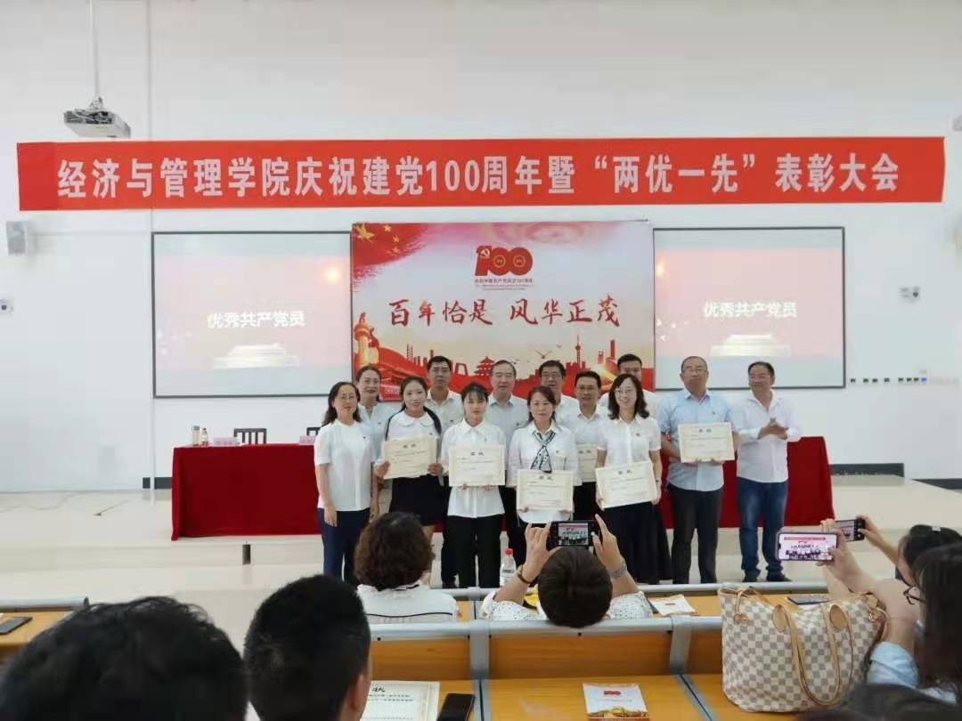 为庆祝中国共产党成立100周年,动员各基层党组织和广大党员不忘初心,牢记使命,推动学院教学、科研和管理服务高质量发展,2021年6月25日下午14点,经济与管理学院庆祝中国共产党成立100周年暨“两优一先”表彰大会在学院楼9315教室召开。学院党委书记吕萍、副书记赵本喜、副院长蒲文彬、副院长王立伟、党委副处级组织员江剑虹、党委委员刘晓婧、学院学位委员会主任陈英葵、致公党师大主委王玮、民主促进会会员思丽妮、无党派教师代表杨俊玲,及学院全体师生党员共200余人参加了大会,大会由赵本喜主持。