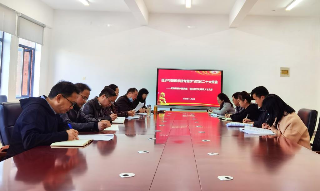 2022年11月2日上午,经济与管理学院在花溪校区学院会议室召开党委理论学习中心组(扩大)学习会议专题学习党的二十大报告,学院党政领导、党委委员、科级干部参加会议。会议由学院党委书记吕萍主持。