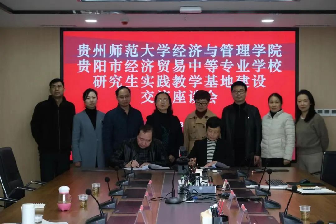 2023年3月9日上午,经济与管理学院党委书记吕萍一行,赴贵阳市经济贸易中等专业学校就研究生实践教学基地建设开展交流座谈并举行签约仪式。贵阳市经济贸易中等专业学校纪委书记康开红、副校长张雯芹等领导出席了交流会和签约仪式。仪式由贵阳市经济贸易中等专业学校副校长杨捷主持。我院2021级在该校实习的研究生列席了会议。