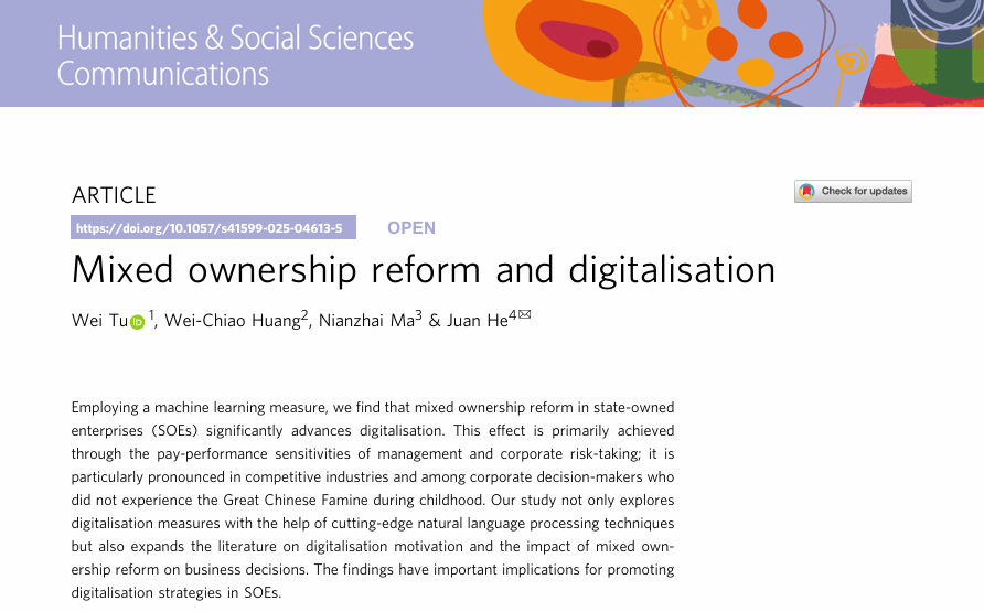 近日,我院涂玮博士在Nature子刊Humanities & Social Sciences Communications杂志在线发表题为“Mixed ownership reform and digitalisation”的研究论文。Humanities & Social Sciences Communications(人文社科通讯)是Nature旗下唯一面向人文社会科学的子刊,出版人文科学、行为科学和社会科学所有领域的高水平研究,同时被A&HCI与SSCI收录,在国内外的人文社科领域具有重要影响力。根据Web of Science期刊引用指数,该期刊在人文学科——多学科领域的409种期刊中排名第3,在社会科学跨学科领域的265种期刊中排名第1。