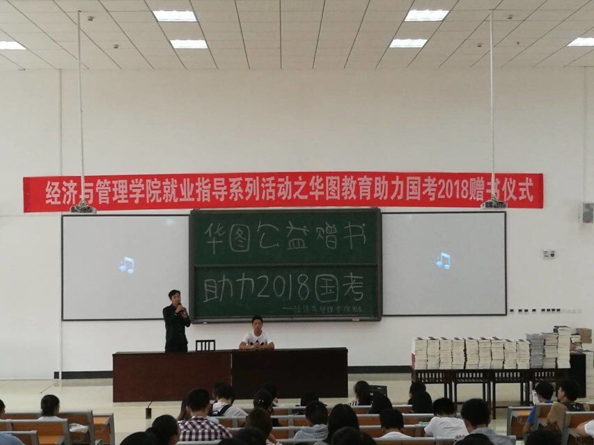 8月28日下午,经济与管理学院就业指导系列活动之华图教育助力国考2018公益赠书仪式在学院楼9315教室举行,学院团委副书记向凯麟、华图教育贵州分校校长龙彦宏、2014级300余名学生参加本次活动。