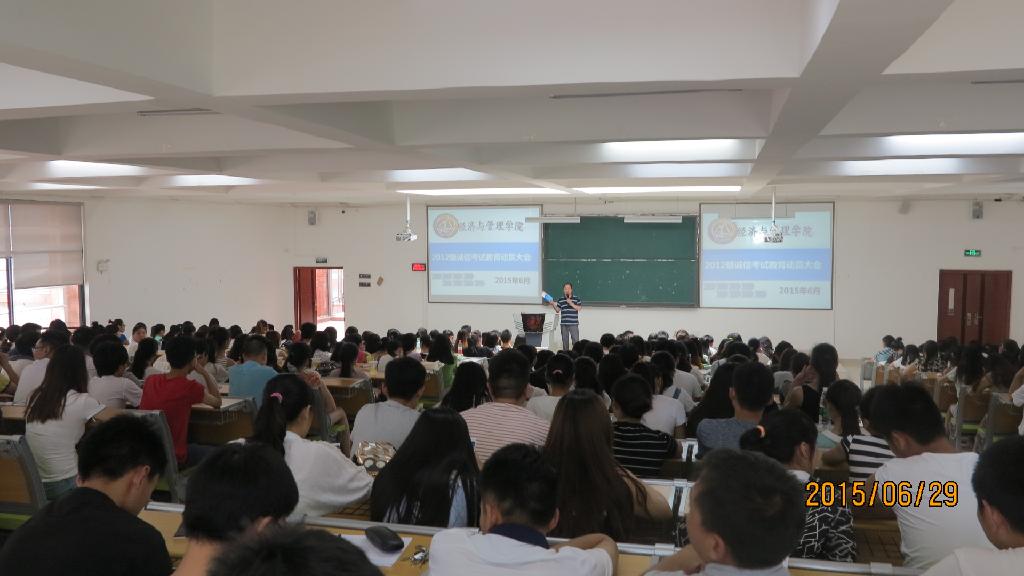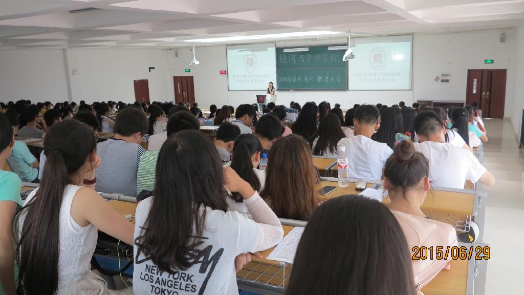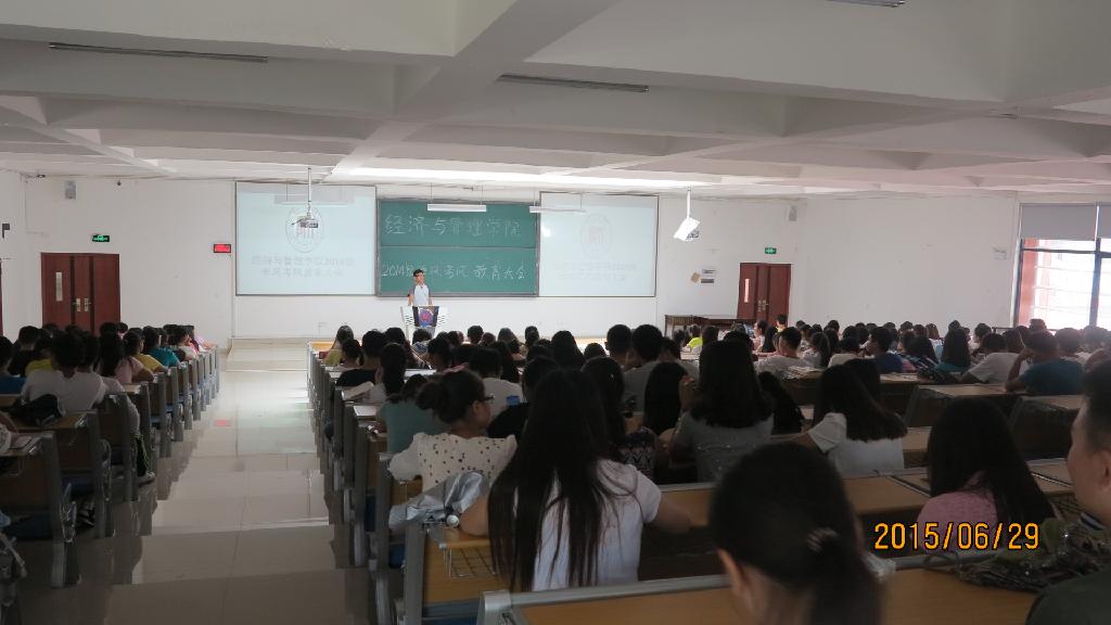 为营造积极向上的学习氛围,树立诚信考试的良好风气,6月29日下午,经济与管理学院在花溪校区GJ6301教室开展了“学风考风教育”大会。这次大会总共分为三场,分别针对三个年级年级特点开展。学院党委副书记项君、党委组织员赵本喜、团委书记张晶晶担任主讲。辅导员向凯麟、赵元钊、李庆及各年级学生近千人分场次参加了大会。