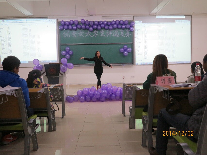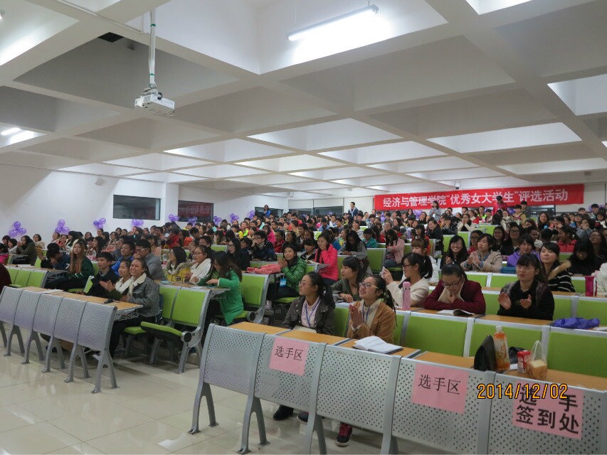 12月02日下午6点,为丰富我院课余文化生活,引导当代女大学生感恩自强,不断提高自身综合素质,经济与管理学院在花溪校区GJ6302教室开展了“优秀女大学生”复赛。通过初赛选拔的30名选手进入复赛,本场比赛由我院12级辅导员向凯麟、13级辅导员赵元钊和14级辅导员李庆以及高年级学生干部代表担任评委,共300余人我院各年级学生观看比赛。比赛由我院学生会承办。