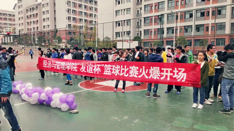 11月14日下午,由经济与管理学院团委主办、学院青分会协办的“友谊杯”篮球赛开幕式在花溪校区篮球场举行。本次活动赞助商博力超市老板朱先生、学院2012级辅导员向凯麟、学院各班运动员、青分会全体成员约百余人到场。开幕式由刘天秀同学担任主持。