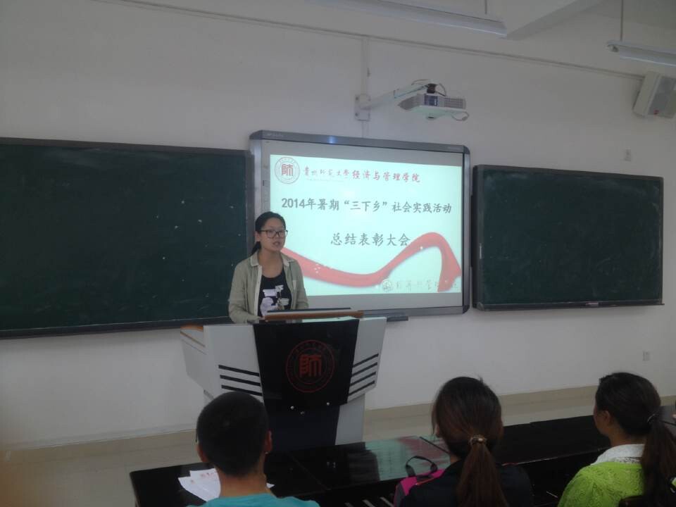 2014年10月14日中午点,经济与管理学院在花溪校区GJ1506教室召开暑期“三下乡”社会实践活动总结大会暨表彰大会,对今年暑期“三下乡”社会实践活动做全面性并对优秀志愿者进行表彰。院团委书记张晶晶、带队教师向凯麟、李庆出席会议,全体三下乡队员以及2014级的全体班委也参加了此次大会。会议由志愿服务队队员张晟男主持。