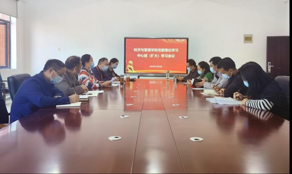 2022年10月25日上午,经济与管理学院在花溪校区学院会议室召开党委理论学习中心组(扩大)学习会议,学院党政领导、党委委员、科级干部参加会议。会议由学院党委书记吕萍主持。