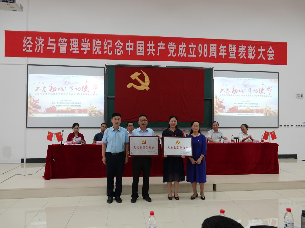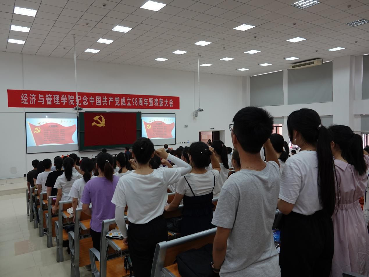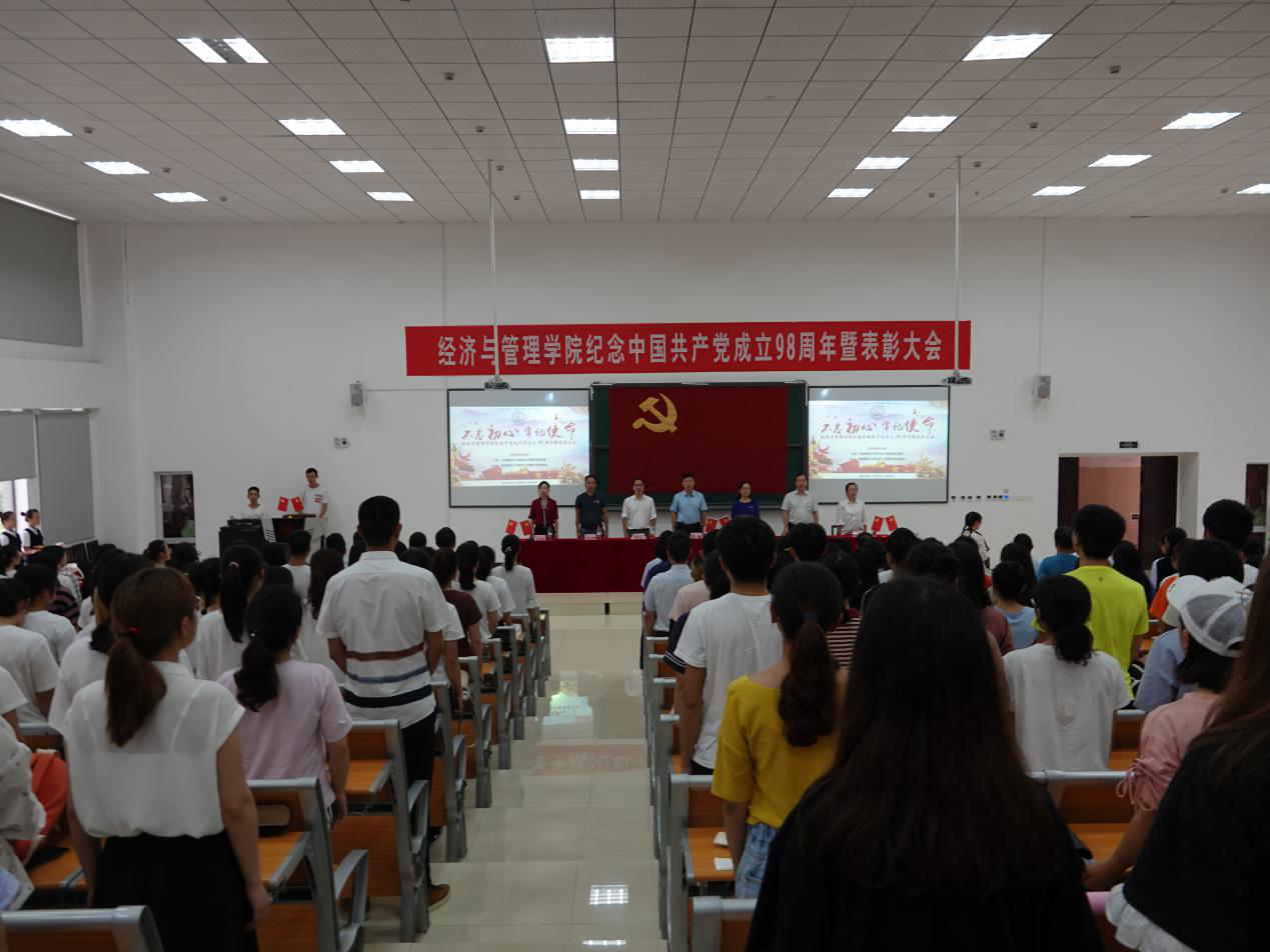 为庆祝中国共产党成立98周年,深入学习贯彻习近平新时代中国特色社会主义思想和党的十九大精神,进一步提升党组织的号召力、凝聚力和战斗力,6月28日,经济与管理学院党委在学院9315教室举行“不忘初心、牢记使命”纪念中国共产党成立98周年暨表彰大会。学院党政班子出席大会,全体师生党员、入党积极分子代表400余人到场参加,院长吕萍主持会议。
