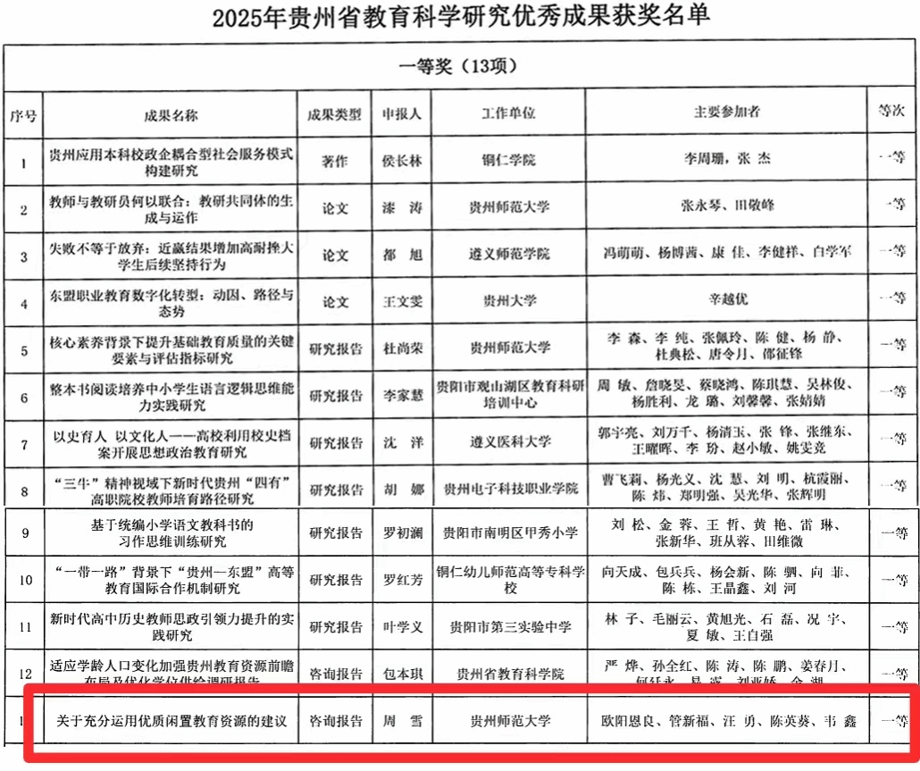 近日,贵州省教育厅公布了2025年贵州省教育科学研究优秀成果的获奖名单。本届教育科学研究优秀成果奖共评选出一等奖13项、二等奖69项、三等奖112项。