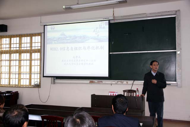 11月19日下午,经济与管理学院特邀武汉大学信息资源研究中心主任、信息管理学院教授、贵州师范大学特聘教授马费成在五教301室为学院师生做讲座,讲座以“Web2.0信息自组织与序化机制”为主题,学院副院长王立伟主...