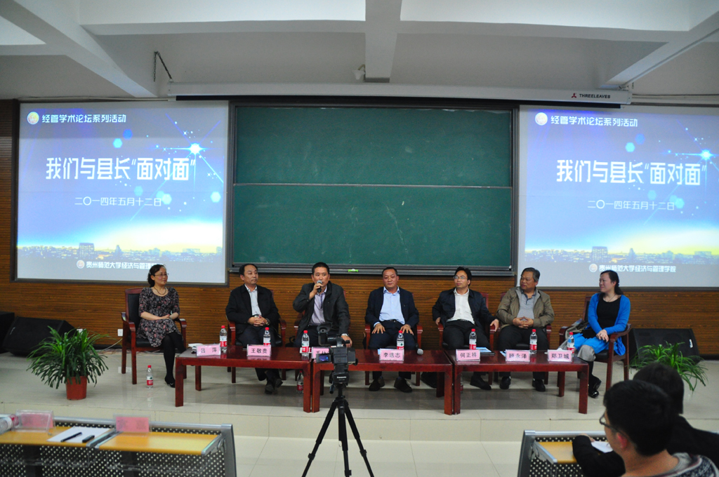 5月12日晚,经济与管理学院在花溪校区GJ6202开展“我们与县长‘面对面’”交流会,本次交流会邀请了贵州省安龙县常务副县长王敬贵、晴隆县常务副县长毛仕城、望谟县常务副县长李选志、册亨县常务副县长何正祥、贵...